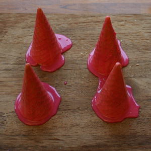 3. Appliquer le glaçage rose sur les cornets de glace qui servent à faire les toits des tours, laisser le glaçage prendre.   4. Appliquer le glaçage blanc sur l’enceinte et les tours du château à l’aide d’une spatule.