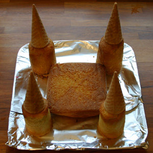 1. Construire les tours: Tapisser les boîtes de conserve avec du papier sulfurisé puis verser la pâte à quatre-quart au 2/3. Faire cuire, démouler.   2. Construire le chateau: couper le gâteau central en forme de carré, placer les tours et les cornets pour faire les toits.