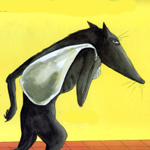 L’histoire traditionnelle de la soupe au caillou se déroule ici parmi les animaux. Les grands thèmes du récit sont présents : la peur de l’autre (ici c’est le loup qui se déplace de lieu en lieu et cherche un foyer pour faire sa soupe au caillou), la convivialité et le plaisir de partager ensemble un repas…